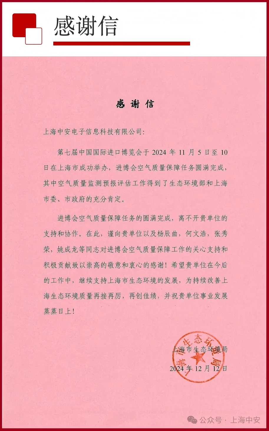 上海市生態環境局致上海中安的一封感謝信!(2025-01-10)